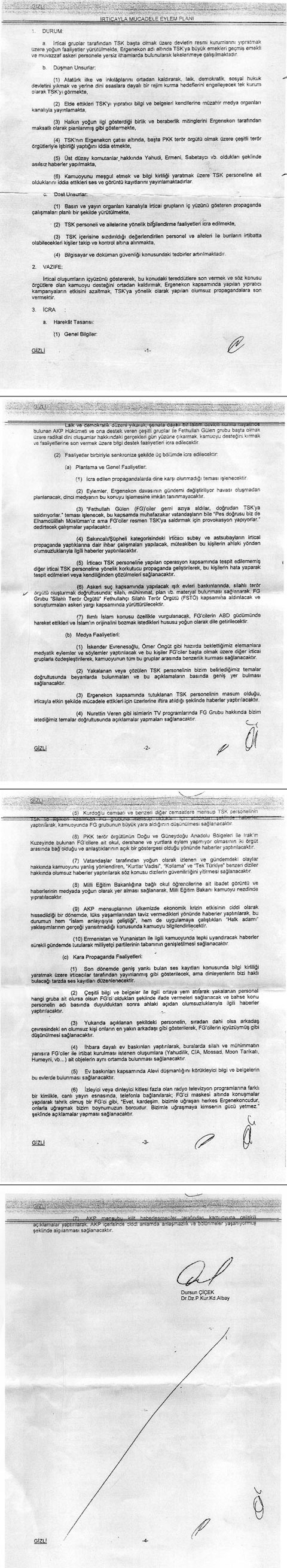 İrticayla Mücadele Planı´nın orijinalinin savcılığa yollandığı öne sürüldü. AK Parti ve Gülen´i bitirme planı olarak da bilinen belgeyi bir subayın yolladığı iddia ediliyor.. Soruşturma süreci Albay Dursun Çiçek imzalı belgenin kopyası üzerinden yürütülmüş; belgenin bu nedenle sahte olduğu ileri sürülmüştü. Org. İlker Başbuğ ise söz konusu belge için ´kağıt parçası´ demişti. Taraf gazetesinin 12 Haziran 2009 tarihli sayısında, ´AK Parti ve Gülen´i Bitirme Planı´ başlıklı haberde İstanbul Cumhuriyet Başsavcılığı´nca (CMK 250. madde ile yetkili bölümü) yürütülen soruşturma kapsamında bir şüphelinin ofisinde yapılan aramada ele geçirildiği iddia edilen bir belgeye istinaden Genelkurmay Harekat Başkanlığı Bilgi Destek Dairesi 3. Bilgi Destek Şube Müdürlüğü´nde ´İrtica ile Mücadele Eylem Planı´ adı altında bir çalışma yapıldığı, çalışmayı içeren belgenin altında 3. Bilgi Destek Şube Müdürü Deniz Kurmay Albay Dursun Çiçek´in paraf ve imzasının bulunduğu iddia edilmiş ve belgeye ait fotokopiler yer almıştı. Taraf gazetesinde yayımlanan haber üzerine Genelkurmay Başkanlığı´nca soruşturma emri verilmiş ve aynı gün Askeri Savcılık tarafından olayla ilgili soruşturma başlatılmıştı. Dursun Çiçek´in imzasını taşıyan ve kamuoyunda ´AK Parti ve Gülen´i Bitirme Planı´ olarak bilinen belgenin ortaya çıkan ilk fotokopileri medyaya yansıdı. Görmek için tıklayın