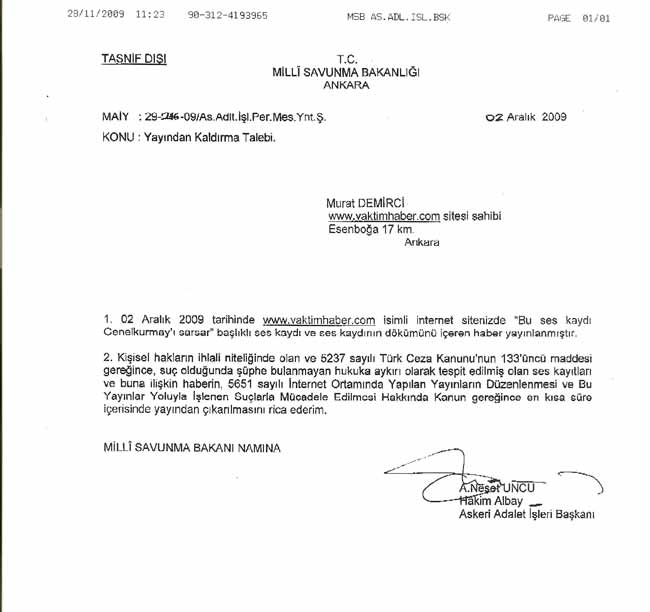 Milli Savunma Bakanlığı, Konu: Yayından kaldırma talebi, ... sitesi sahibi. 1. 02 Aralık 2009 tarihinde ... isimli nternet sitenizde ´Bu ses kaydı Genelkurmay´ı sarsar´ başlıklı ses kaydının dökümünü içeren haber yayınlanmıştır. 2. Kişisel hakların ihlali niteliğinde olan ve 5237 sayılı TCK´nun 133´ncü maddesi gereğince, suç olduğuna şüphe bulunmayan hukuka aykırı olarak tespit edilmiş olan ses kayıtları ve buna ilişkin haberin, 5651 sayılı İnternet ortamında Yapılan Yayınların Düzenlenmesi ve Bu Yayınlar Yoluyla İşlenen Suçlarla Mücadele Edilmesi Hakkında Kanun gereğince en kısa süre içerisinde yayından çıkarılmasını rica ederim. Milli Savunma Bakanlığı namına, A. Neşet UNCU, Hakim Albay, Askeri Adalet işleri Başkanı ( Aktifhaber)