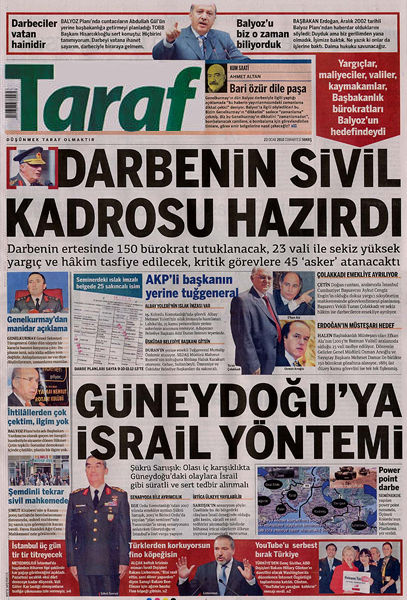 Senaryo ve eğitim amaçlı tatbikat planı denilerek masum gösterilmeye çalışılan EMASYA merkezli ´Balyoz´ darbe planının gerçekliği Taraf´ın yayınlamaya devam ettiği ayrıntılarla giderek somutlaşıyor. En ince ayrıntılarına kadar planlanan darbede görev alacak, tutuklanacak ve faydalanılacak tüm isimler ortaya çıkıyor. Balyoz planının kamuoyunu en çok sarsan ayrıntılarından biri görev alacak ve tutuklanacak isimlerin ortaya çıkması oldu. Medya mensupları, darbe hükümetinde görev alacak kişiler ve şimdi de sivil bürokratlar.. Darbenin ertesinde 150 bürokrat tutuklanacak, 23 vali ve 8 yüksek yargıç hakim tasfiye edilecek, kritik görevlere 45 ´asker´ atanacaktı.