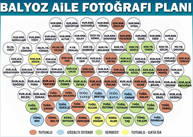 Balyoz Darbe Planı´nda ismi geçen Korgeneral´den Üsteğmen´e kadar 162 kişilik isim listesini bugün Habertürk Gazetesi yayınladı. Balyoz seminerine katılan subayların hatıra fotoğraflarının çekiminde kullanılacak olan yerleşim planında 162 subayın ismi yer alıyor.