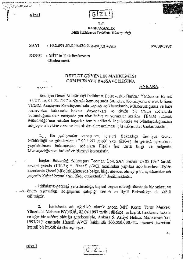 Bizzat MİT Müsteşarı Sönmez Köksal imzalı dilekçede şöyle denildi: “Adıgeçenin dilekçesinde sıraladığı telefon numaralarının tetkikinden; bunlardan üçünün Müsteşarlığımız adına kayıtlı resmi telefonlar olduğu, diğer üçünün ise operasyonel faaliyetlerimizin önemi, özelliği ve gizliliği gereği gerçek kişiler adına kayıtlı görülmesine rağmen, Müsteşarlığımız görevlerinin ifası sırasında mensuplarımız tarafından kullanılan ve tüm masrafları Müsteşarlığımızca karşılanan telefonlar olduğu anlaşılmıştır. Davalının hangi tarihlerde, kimin, hangi numaralı telefonla ve hangi kişiyle görüştüğünü bildiğini ileri sürmesi ve bunu resmi kayıtlarla doğrulatmak istemesi, kendisinin bu görüşmeleri dinlediğini ve hatta bir kısmını da olsa banda kaydettiğini göstermektedir. Telefon görüşmelerinin dinlenmesi işlemi, Ceza Muhakemeleri Usulü Kanunu´nun 92´nci maddesinin son fıkrası gereğince sadece hakim kararına bağlıdır. Hanefi Avcı´nın, gerek telefon numaralarını tespit ederken, gerek bu telefonlarla yapılan görüşmeleri banda alırken ve gerekse bunları dinlerken; ne savcı ne de hakim kararı aldığı; emrinde görev yaptığı Emniyet Genel Müdürlüğü´ne dahi haber vermediği; tamamen kişisel amaçlarla yasadışı bir hareket tarzını benimsediği anlaşılmıştır.”