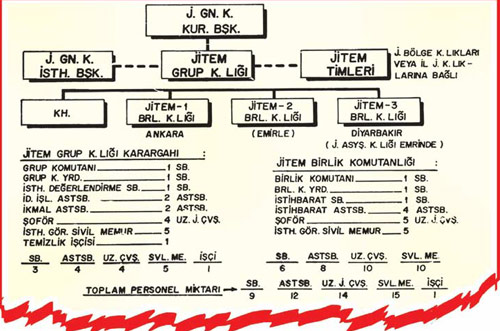 “27 Ağustos 1987 tarihinde Jandarma Genel Komutanlığı İstihbarat Başkanlığı´na bağlı olarak Jandarma İstihbarat ve Terörle Mücadele Grup Komutanlığı (JİTEM) kurulmuştur. Başlangıçta üç timi kurulu, (Mardin, Silopi, Batman) dört timi sonradan kurulacak statüde göreve başlamış ve Batman, Siirt, Şırnak ve Mardin faaliyet alanı olarak belirlenmiştir. Jandarma İstihbarat ve Terörle Mücadele timleri 14 Eylül 1987 tarihinde Jandarma Asayiş Komutanlığı Harekat Komutası´na, Kasım 1988´de de emrine verilmiştir. Emirle kurulacak statüdeki timlerden bir adedi 1988, iki adedi ise 1989 yılında faaliyete geçerek tim sayısı altıya çıkarılmıştır. Timlerin başarılı olması üzerine Mayıs 1990 tarihinde 78 grup ve bu gruplara bağlı 24 tim halinde Jandarma İstihbarat Gruplar Komutanlığı reorganize edilmiş, ancak bu üniteler personel yetersizliği nedeniyle istenilen düzeyde kurulamamıştır. 18 Temmuz 1991 tarihinde İstihbarat Gruplar Komutalığı´nın kuruluş ve kadrosu (J.T.M.K.1-22) yürürlükten kaldırılmış ve Ankara´da Kurmay Başkanı´na bağlı bir istihbarat grup ve bağlı iki timi, Diyarbakır´da bir istihbarat grup ve bağlı altı tim ile İstanbul, İzmir ve Adana´da jandarma bölge komutanlıklarına bağlı birer istihbarat timi kurulmuştur. Toplam iki grup, on bir tim halen bu kuruluş içerisinde faaliyetlerini sürdürmektedir.”