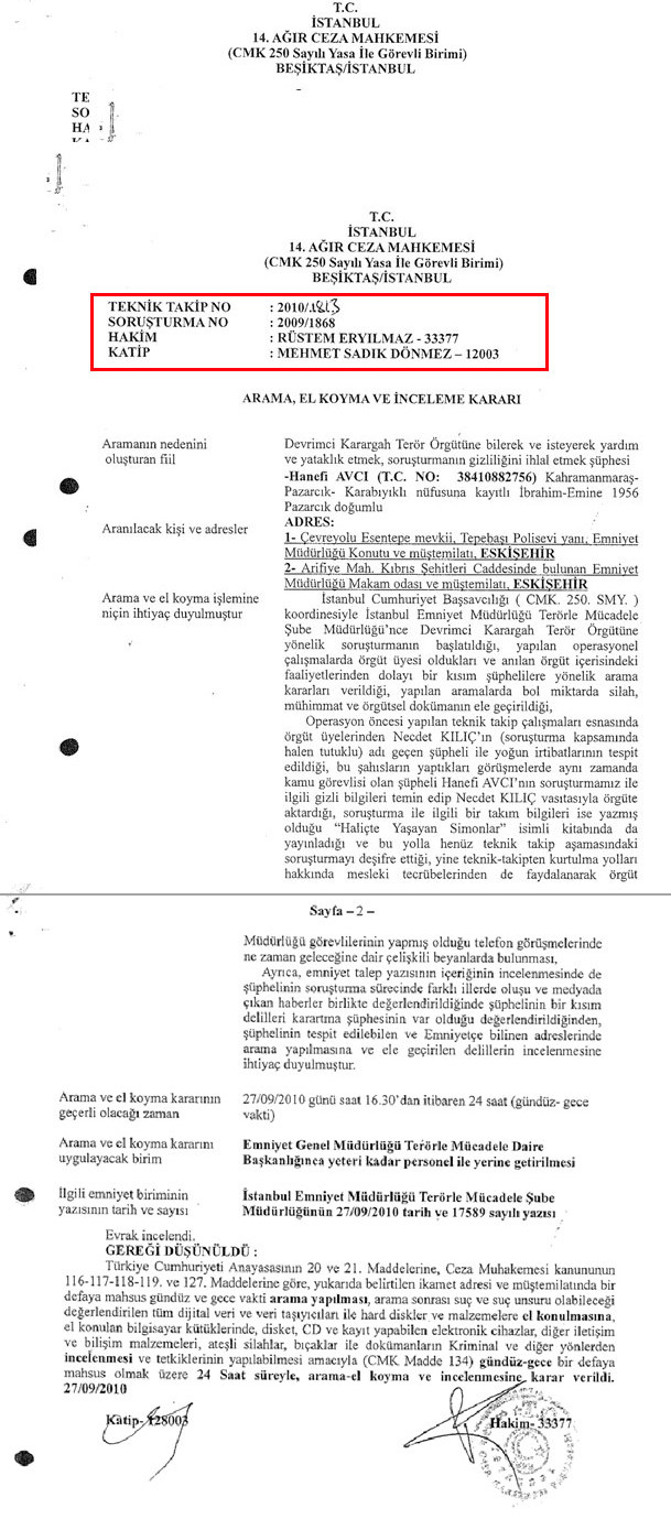 Hürriyet gazetesi, dün (03 Ocak 201) tarihli haberinde, Devrimci Karargah Örgütü´ne yardım ve yataklık yaptığı iddiasıyla tutuklanan eski Eskişehir Emniyet Müdürü Hanefi Avcı´nın makam odasında arama yapılmasına ilişkin hakim kararı olmadığının ortaya çıktığını iddia etmişti. Hürriyet haberinde, 14. Ağır Ceza hakimi Rüstem Eryılmaz´ın görüşünü aktarmış ve Eryılmaz´ın, arama kararı verdiğini ancak bu kararın Avcı´nın makam odası kapsamadığını iddia ettiğini belirtmişti. Habervaktim´in elde ettiği resmi belgeler ise hem Hürriyet gazetesini hem de Hakim Rüstem Eryılmaz´ı yalanlıyor.