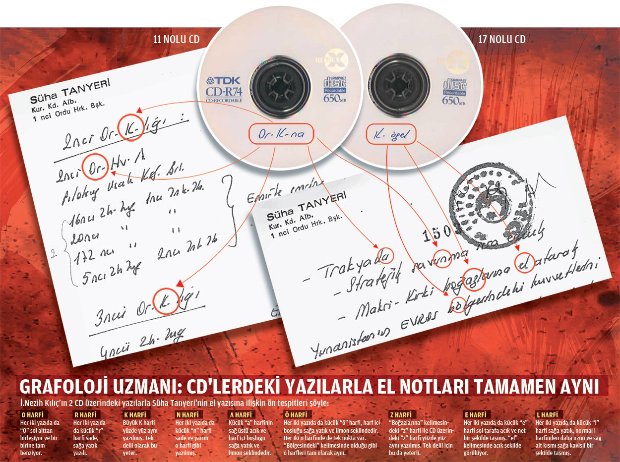 Balyoz darbe planı davasının en önemli delilleri arasında yer alan 11 No´lu CD´nin gerçekliğini teyit eden önemli bir iddia gündeme geldi. Zaman´ın yayımlandığı CD´lerden üzerinde ´OR.K.´na´ notu yazılı 11 numaralı CD ile ´K.Özel´ yazan 17 numaralı CD´yi inceleyen uzmanlar, el yazılarının dönemin 1. Ordu Komutanlığı Harekat Başkanı emekli Tuğgeneral Süha Tanyeri´ne ait olduğunu öne sürdü. Grafoloji uzmanlarına bu tespiti yaptıran delil ise Tanyeri´nin, harekat planı görüşülürken tuttuğu notlardaki el yazıları. Uzmanlar, CD´lerin üzerindeki yazıların, Tanyeri´nin toplantı el notları olarak ek klasörlere giren belgelerdekiyle aynı olduğunu belirtiyor. Grafoloji uzmanı İ. Nezih Kılıç, iki CD´deki bilgi notuyla, Süha Tanyeri antetli kâğıtlardaki el yazılarının birebir uyduğunu dile getiriyor.