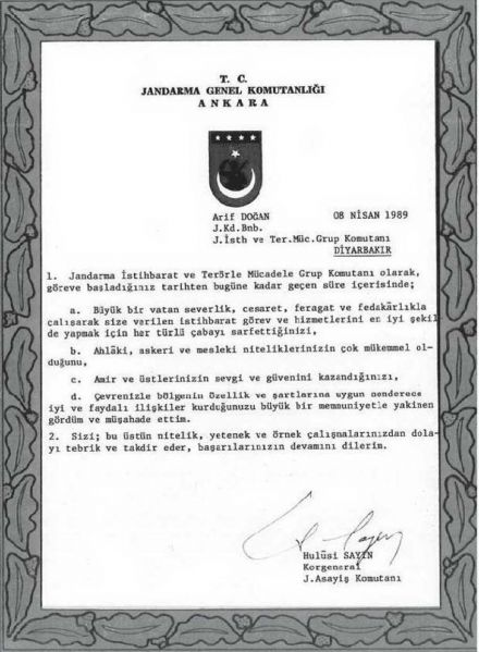 JİTEM´i ispatlayan belgeler: Jand. Komutanı Korg. Hulusi Sayın´dan Arif Doğan´a tebrik yazısı