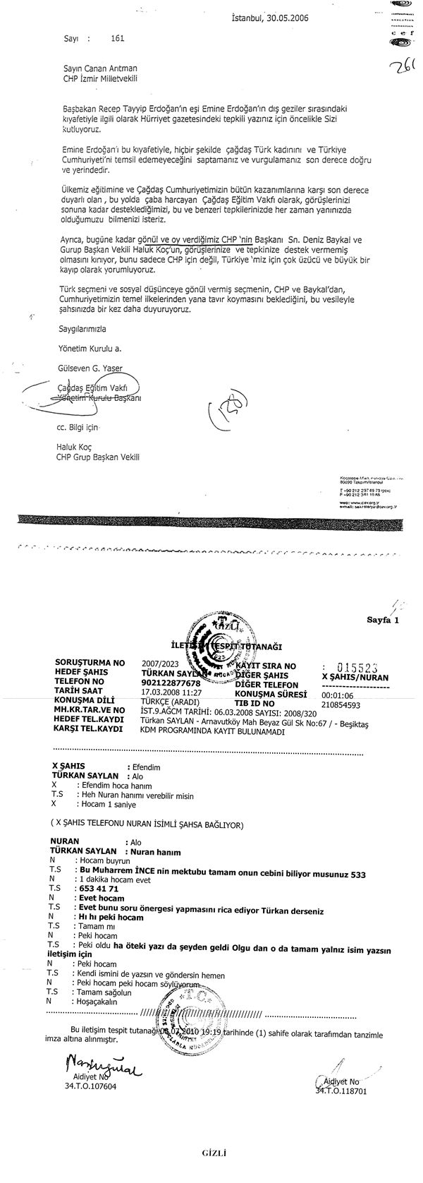 ´Ergenekon Terör Örgütü´ soruşturması kapsamında Çağdaş Yaşamı Destekleme Derneği (ÇYDD) ve Çağdaş Eğitim Vakfı (ÇEV) yöneticileri ile üyelerinden oluşan 8 şüpheli hakkında hazırlanan iddianamenin delil klasörlerinde ilginç belgeler ve telefon görüşmeleri yer alıyor. Ergenekon Terör Örgütü´nün firari sanığı ÇEV Başkanı Gülseven Yaşer, Yönetim Kurulu adına; CHP İzmir Milletvekili Canan Arıtman´a gönderdiği ÇEV antentli yazıda, CHP´ye oy verdiklerini açıklıyor. Yaşer, CHP için, “Bugüne kadar gönül ve oy verdiğimiz parti” tanımlamasında bulunuyor.