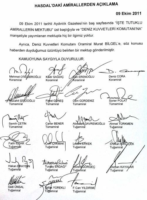 23 amiralin imzasını taşıyan yalanlama mektubunu görmek için tıklayın