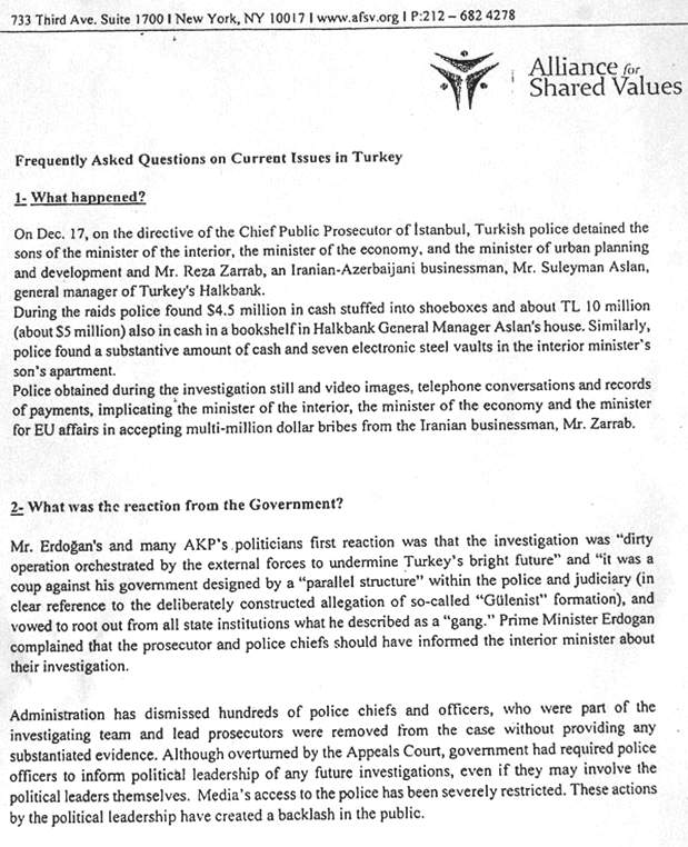 Sizin de farkettiğiniz gibi, Türkiye’deki muazzam büyüklükteki bir yolsuzluk soruşturması dünya çapında manşetleri oluşturdu ve aynı zamanda, New York Times, Wall Street Journal, Washington Post ve daha birçok ABD yayınlarında yer aldı. Şu ana dek, skandallar 3 Bakan’ın istifasına ve 5 milletvekilinin de AK Parti’den istifasına sebebiyet verdi. Birçok bürokrat ve diğer sektörlerden kişiler, AK Parti’nin ve onun liderliğinin, sözkonusu soruşturmaya müdahale etme, yargıya, savcılara, polise ve basına gözdağı verme çabalarını protesto etti.