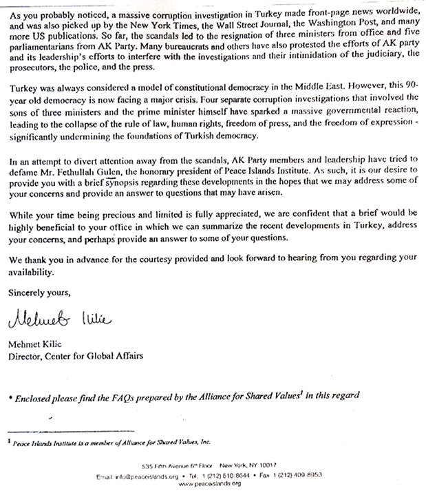 Fethullah Gülen'in 'Onursal Başkanı' olduğu ABD'deki Peace Islands Institute'ün Küresel İşler Merkezi Direktörü Mehmet Kılıç imzasıyla gönderilen mektuplar ortaya çıktı. Türkiye aleyhine tam bir 'ispiyon' niteliğindeki mektuplarda; Başbakan Erdoğan'ın Gülen'i karalayarak dikkatleri başka yönlere çekmeye ve yolsuzlukları örtbas etmeye çalıştığı ileri sürülüyor, Erdoğan'ın yolsuzluklara bizzat karıştığı ve şüpheli olduğu ima ediliyor. BM'ye üye tüm ülkelerin büyükelçiliklerine gönderilen mektuplarda cemaatin siyasete karışmadığı da iddia ediliyor. Mektuplar, akıllara Azetbaycan'daki cemaat yetkilisinin Gülen'e yazdığı mektubu hatırlattı. Azerbaycan örgütlenmesinde yaşanan zorluklara dikkat çekilen mektupta, cemaatin yabancı ülkelerdeki nüfuzu kullanılarak Azerbaycan üzerinde baskı kurulması istenmekteydi. Azerbaycan'ı karıştıran bu mektuptan kısa süre sonra önemli gelişmeler peşpeşe geldi. Cemaat faaliyetleri durduruldu. PII'nın bu mektuplarına benzer hatta çok daha somut başka bulgular da mevcut. Şaşırtıcı şekilde hepsi birbiriyle örtüşen bu bulgular cemaat yöneticilerinin daha önce gündeme gelen bir tercihi yaptıklarını gösteriyor.